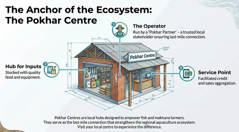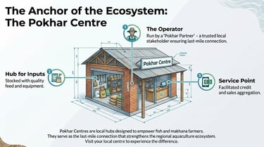 Pokhar Centres are local hubs empowering fish and makhana farmers with quality inputs, facilitated credit, and efficient services through trusted Pokhar Partners. These centres also provide access to formal finance, scientific knowledge, and support for government schemes, serving as vital last-mile connections to strengthen the regional aquaculture ecosystem and foster farmer success. Visit your local centre to experience the difference.
